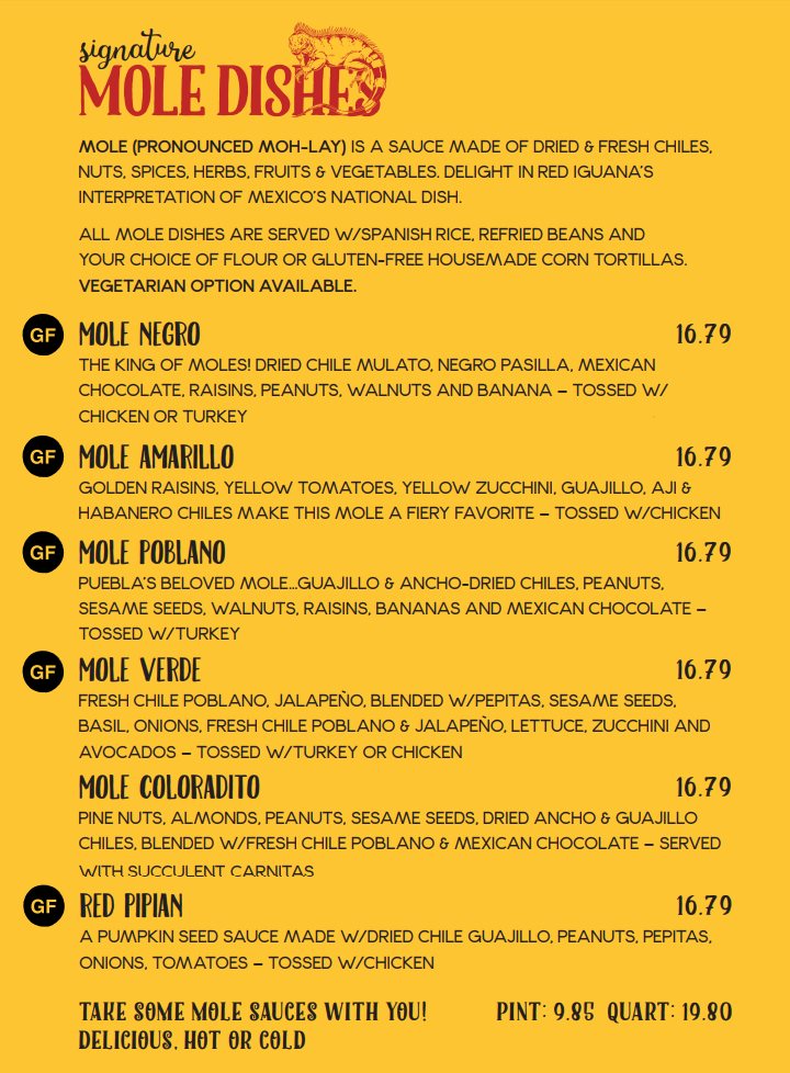 Red Iguana menu – mole dishes We are not affiliated with this business. Prices, ingredients, nutrition and menu options are provided only as a reference and may be outdated and incorrect. Always confirm prices directly with the listed businesses.